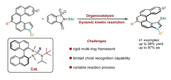 上海交通大学陈志敏课题组报道了基于动态动力学拆分策略的不对称亲电硫代反应,成功实现了螺旋手性含硫氮杂-[5]螺烯的高效、高对映选择性合成 。...